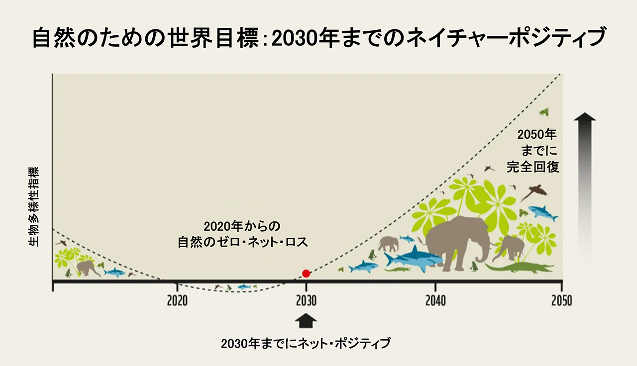 ポイントは、損失を食い止めるのではなく、2050年までに回復させるということです。その実現に向けて、2030年までに必要な手段を講じつつ、生物多様性の保全と持続可能な利用、そしてネイチャーポジティブ の達成がミッションとして掲げられています。